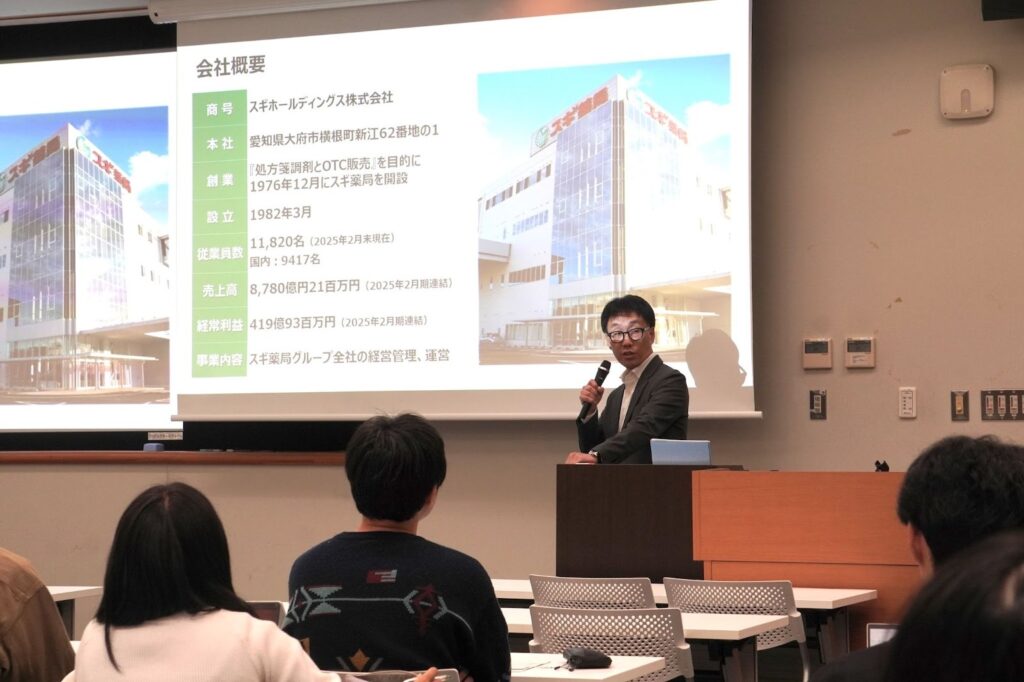授業冒頭では、スギホールディングス株式会社の企業紹介がありました。全国展開する店舗ネットワークを基盤とした「トータルヘルスケア戦略」や、自治体との包括協定による健康まちづくり、デジタル活用の取組などが紹介されました。