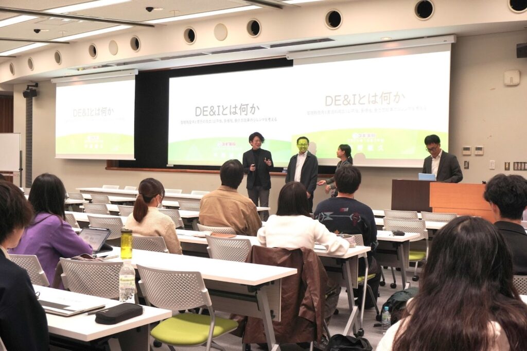 本授業は、働き方の多様化が進むなかで、学生が企業の現実的な課題に向き合いながら「DE&Iとは何か」を考えることを目的に行われました。
