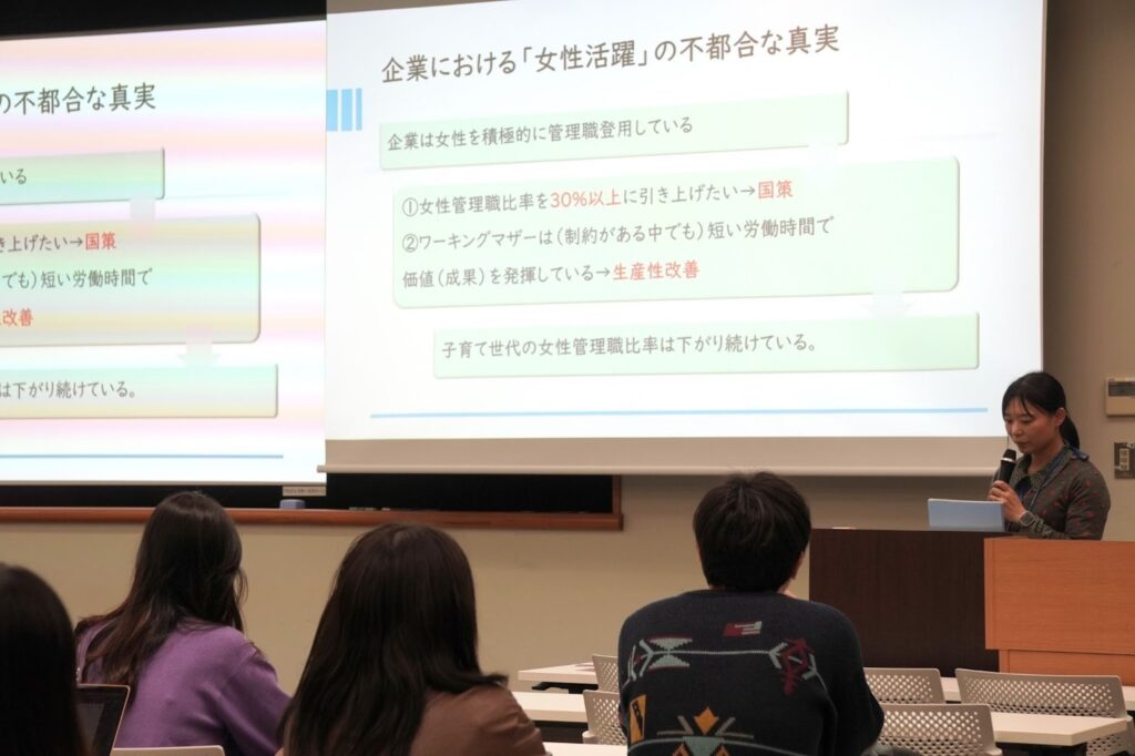 テーマ①「女性管理職比率向上の是非」では、学生からは「女性管理職を増やさない理由が見当たらない」というコメントも上がりました。議論の中では、採用時点での女性の母数拡大や、管理職への心理的・物理的ハードルを組織全体で下げる必要性が指摘され、具体的な施策として、候補者向け座談会や、業務分担を前提とした「部長補佐制度」の導入など、多様な人材が自然に活躍できる環境づくりが提案されました。